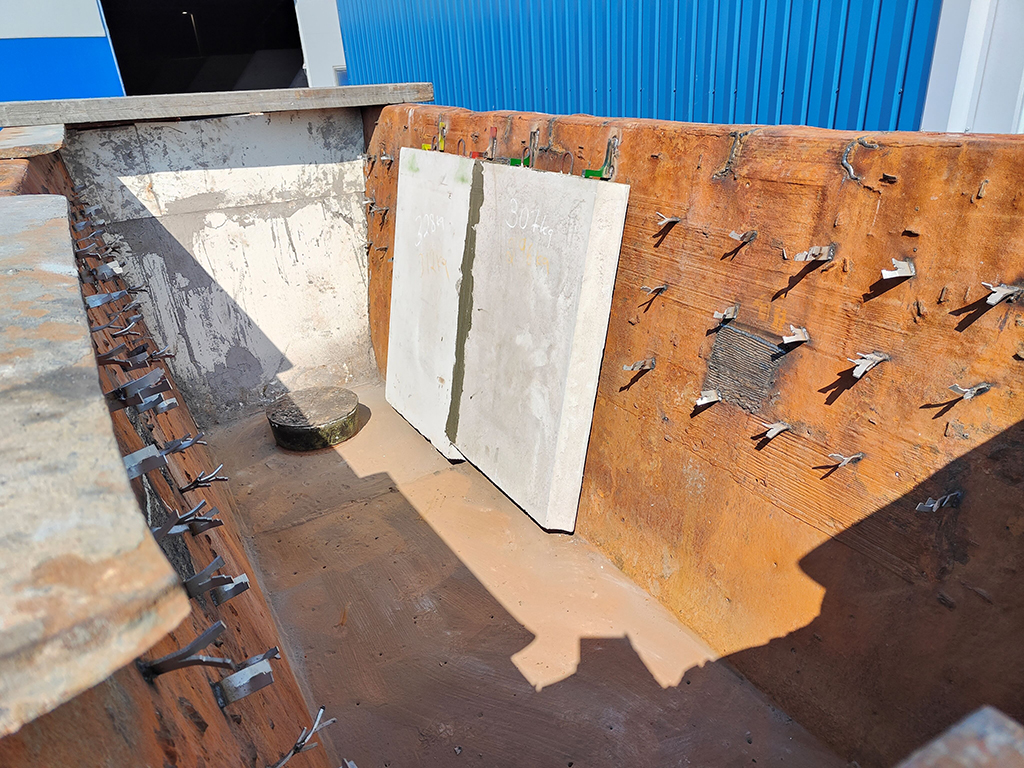 Vi testar den nya elementpraxisen i en av våra kunders gjutlådor, där vi har installerat två separata bakgrundselement. För att på bästa sätt få fram skillnaderna i slitaget gjorde vi resten av infodringen med traditionell gjutmassa. Elementen är installerade i mittpartiet av gjutlådan, där slitaget är som störst. Vårt mål är att gjutlådan i framtiden ska kunna fodras helt med element. Då skulle alla delar av gjutlådan, från botten till väggarna, enkelt gå att reparera vid behov.
